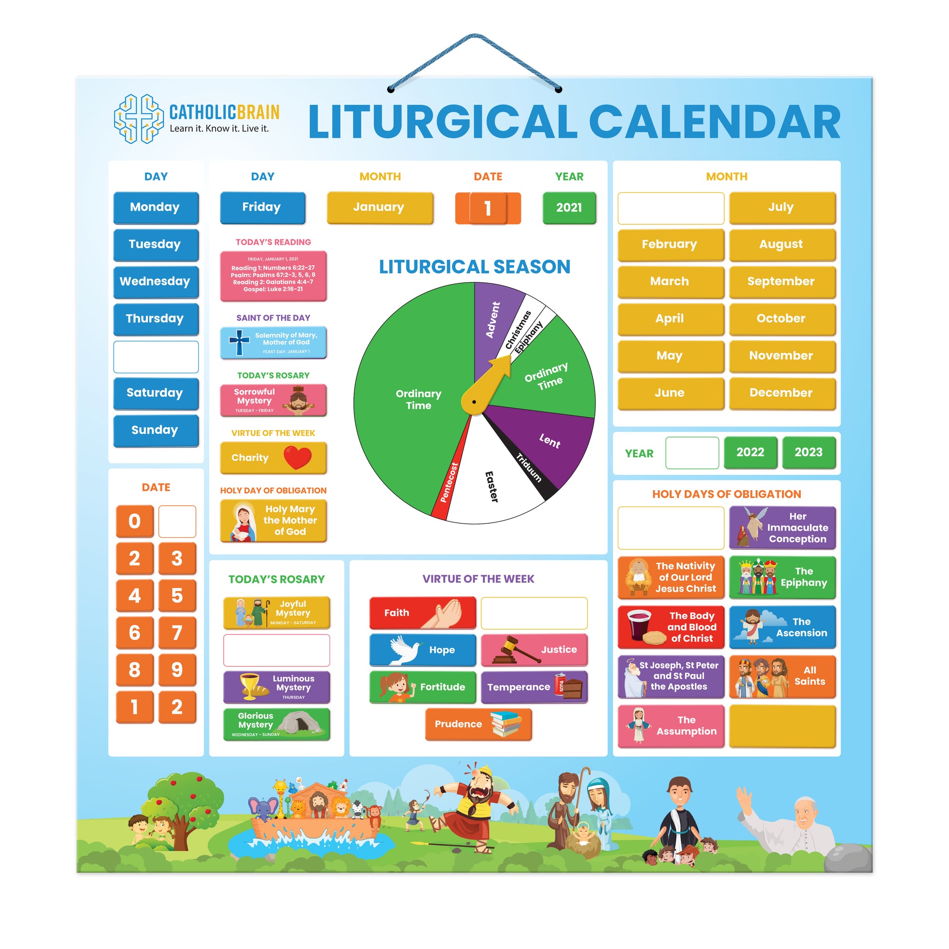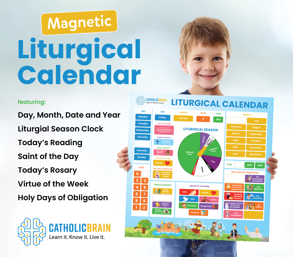 The Magnetic Liturgical Calendar contains a colorful magnet board with 159 magnets and a convenient hanging cord. Fun and engaging for the entire family! Measures 16" × 13".